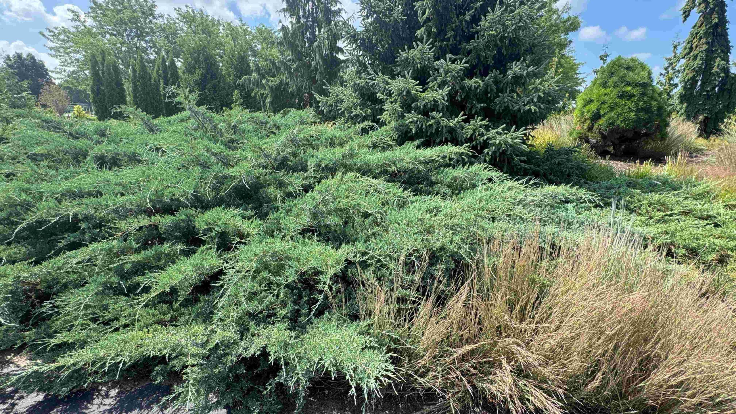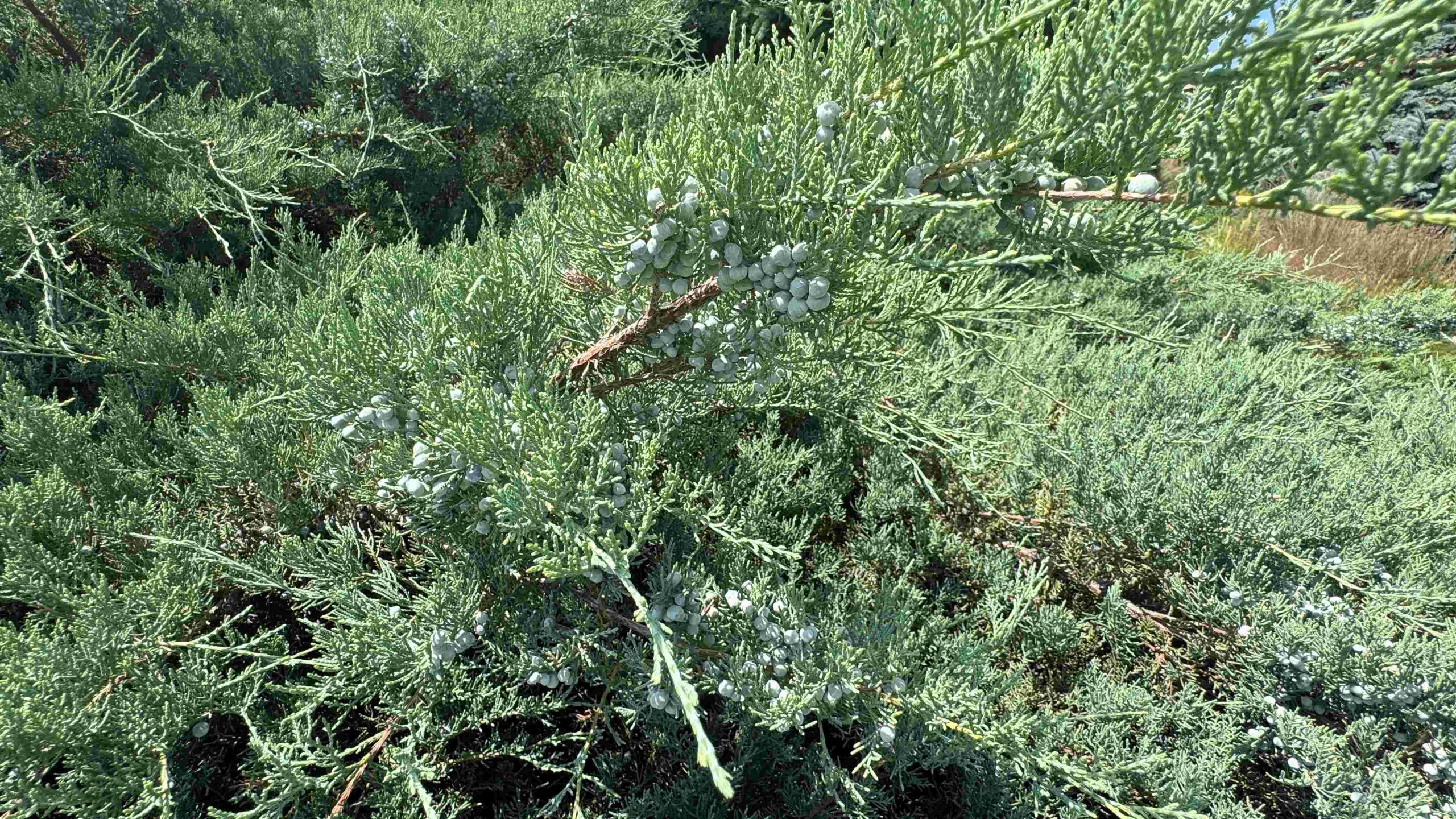 Horizontal bush form of Juniper has deeper blue foliage and fruit than ‘Grey Owl.’